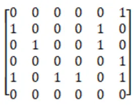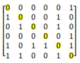 Starting at vertex 1, there is one outbound edge to vertex 6. So, the first entry in the adjacency matrix is at row 1, column 6. We change the 0 to 1 to indicate that there is an edge from vertex 1 to vertex 6.