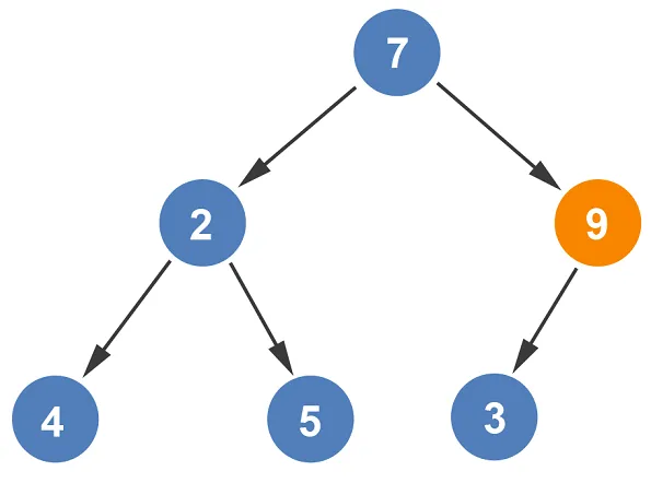 Since 9 has only one child node, 9 will be compared to 3. If the parent is less than the child, the nodes will be swapped. Since 9 is larger than 3, the nodes are not swapped. We move to the 2nd node.