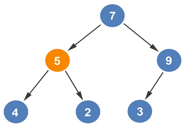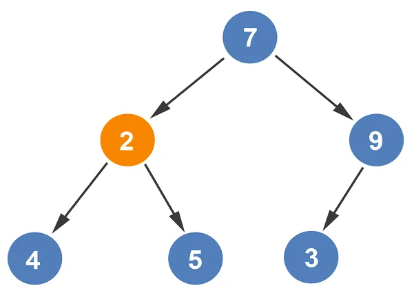 The 2nd node has two children. The larger of the two is 5, so 5 is compared with 2. Since 5 is larger than 2, the two values are swapped.