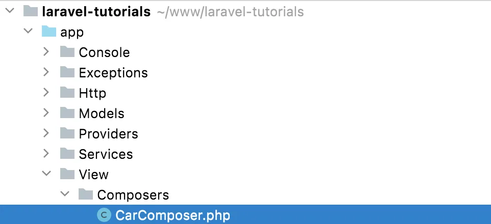 I’ll create a View/Composers directory and then create a CarComposer class inside there. There’s no artisan command for this one. We’ll simply need to create a class called CarComposer.