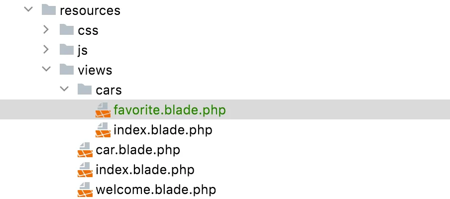 One such blade file that we created in the previous article is resources/views/cars/index.blade.php. It currently outputs a list of my favorite cars wrapped in a ul list.